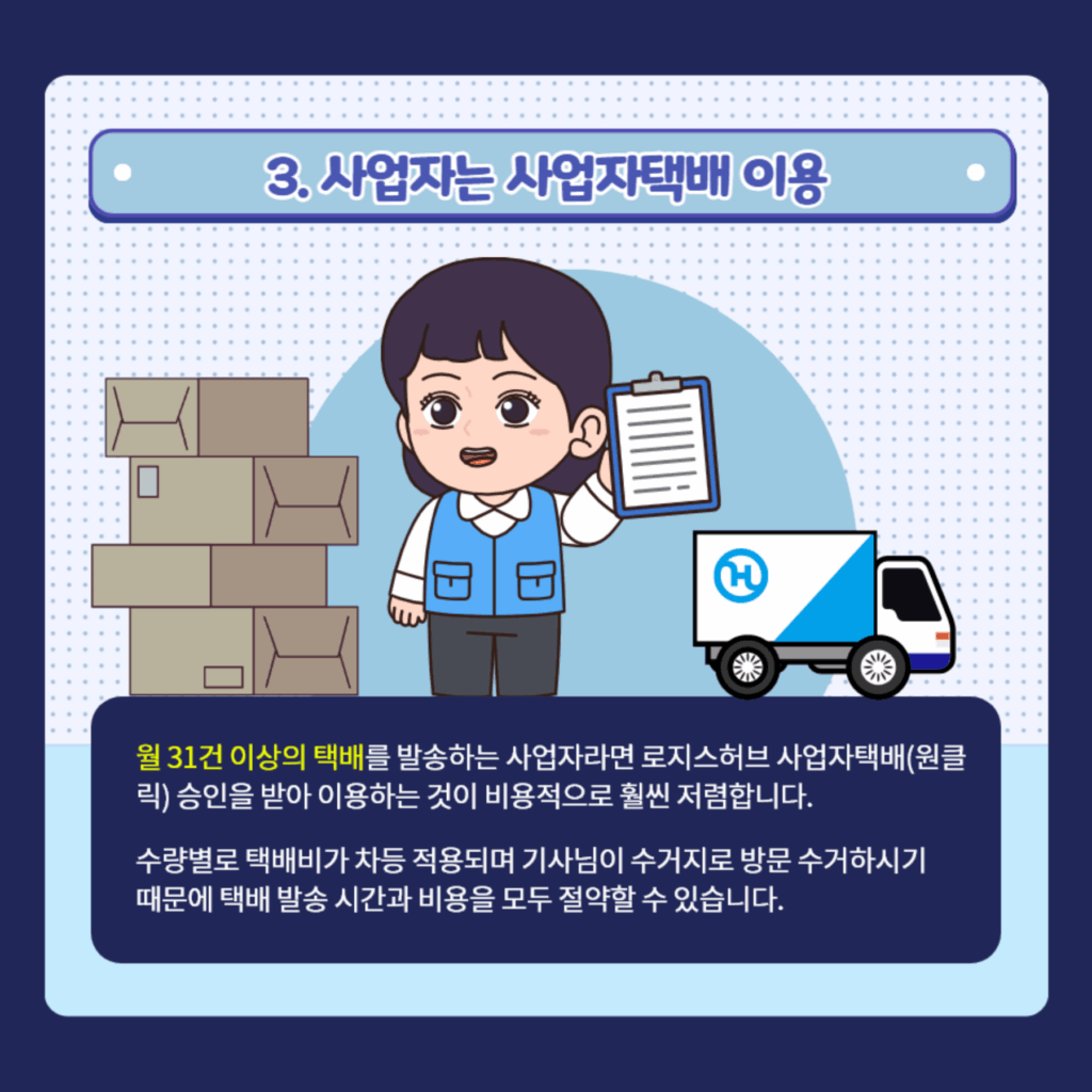 로지스허브에서 사업자택배 신청 후 승인받아 이용하면 더욱 저렴합니다.